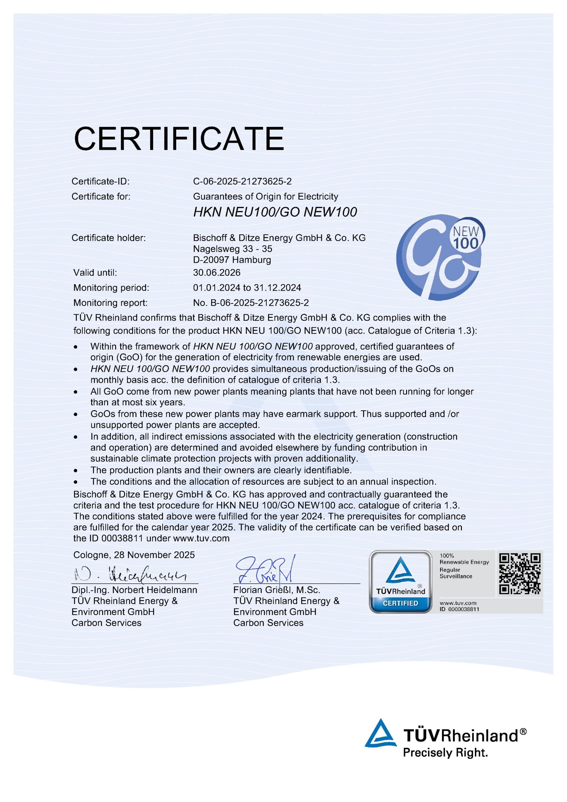As a globally renowned independent auditor, the TÜV Rheinland Energy GmbH certifies Go NEW100 on an annual basis. This review is based on our publicly and transparently kept Catalogue of Criteria.