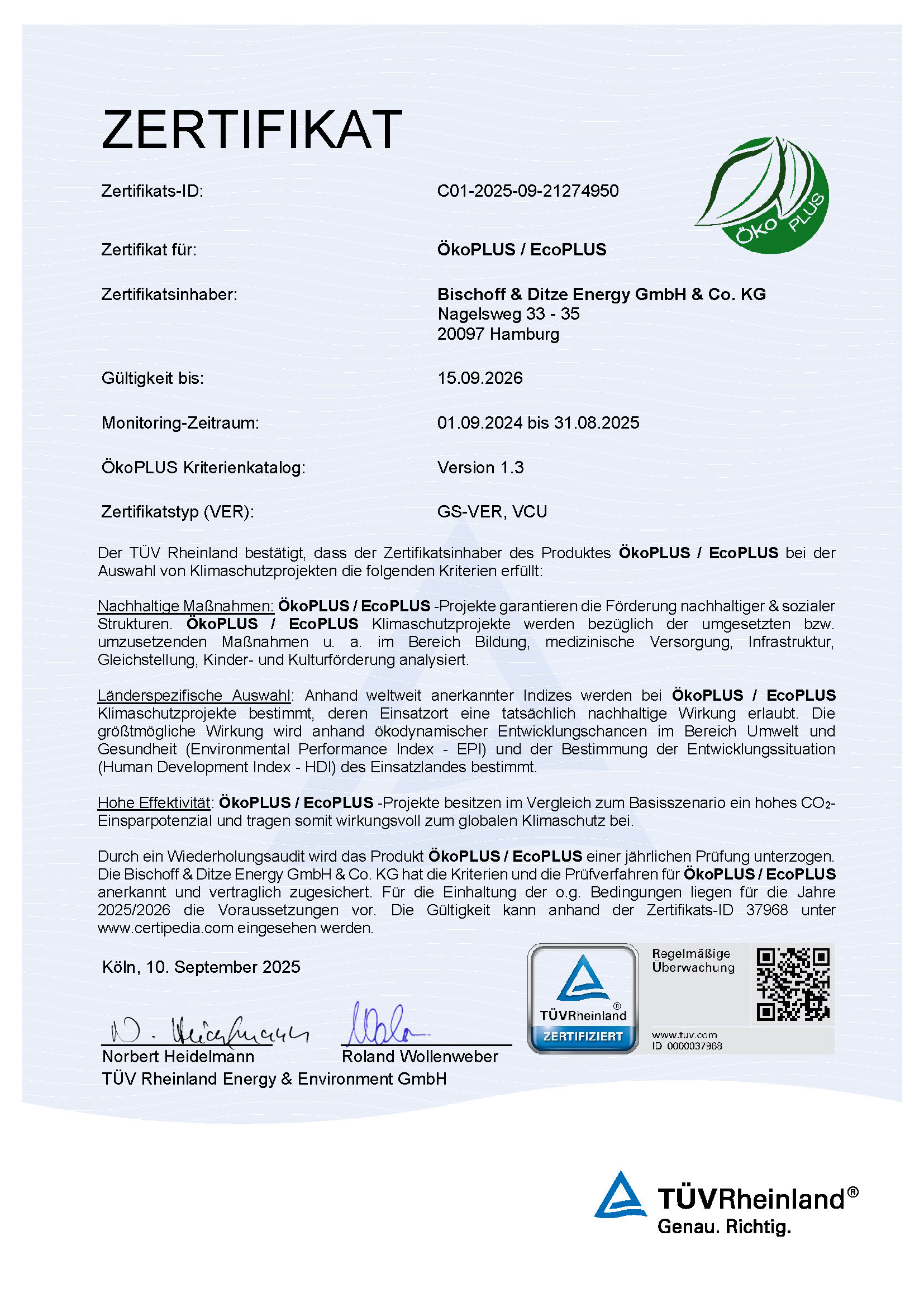 - Die ÖkoPLUS Zertifizierungsurkunde des TÜV Rheinlands
