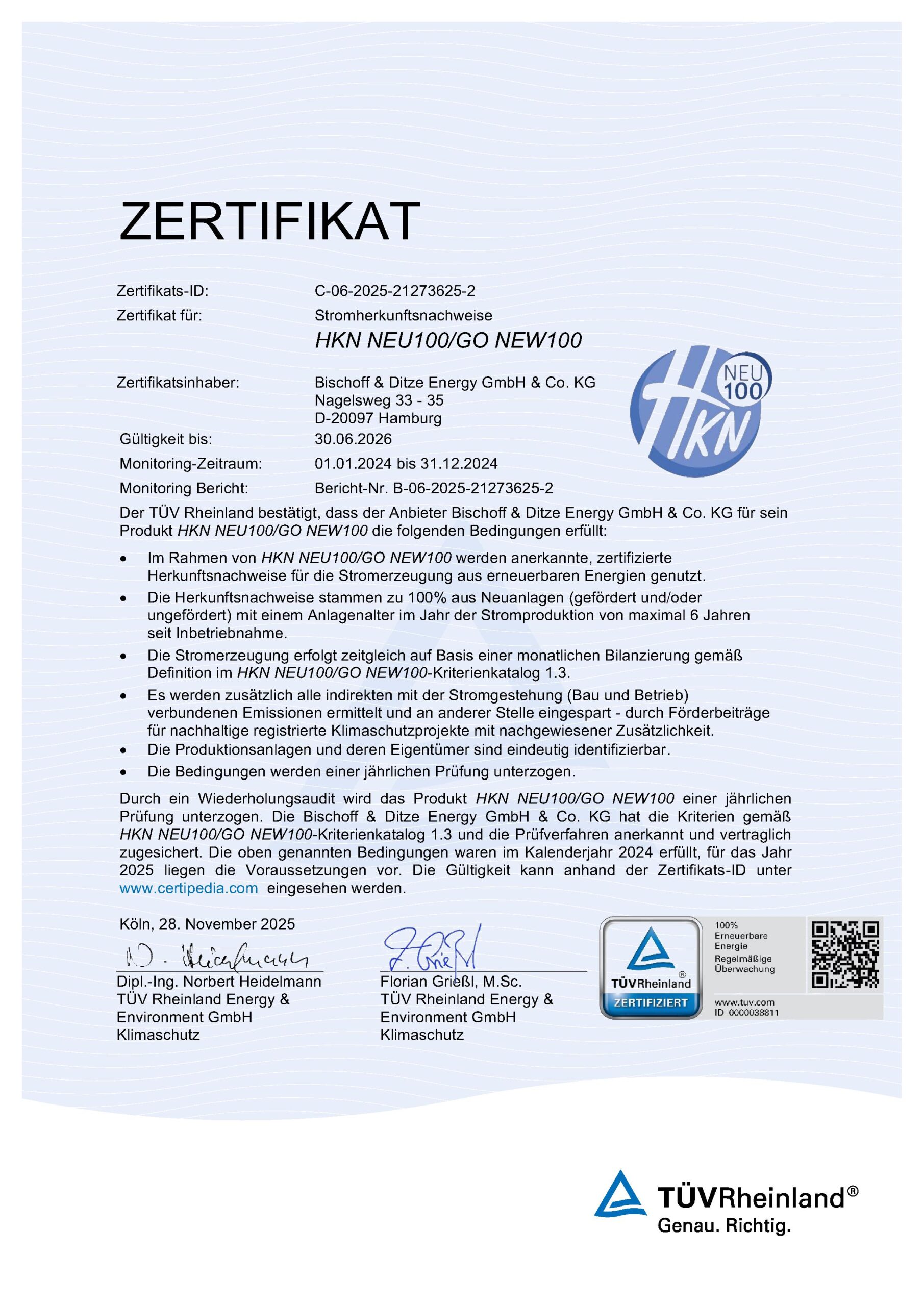 - die HKN NEU100 Zertifizierungsurkunde des TÜV Rheinland